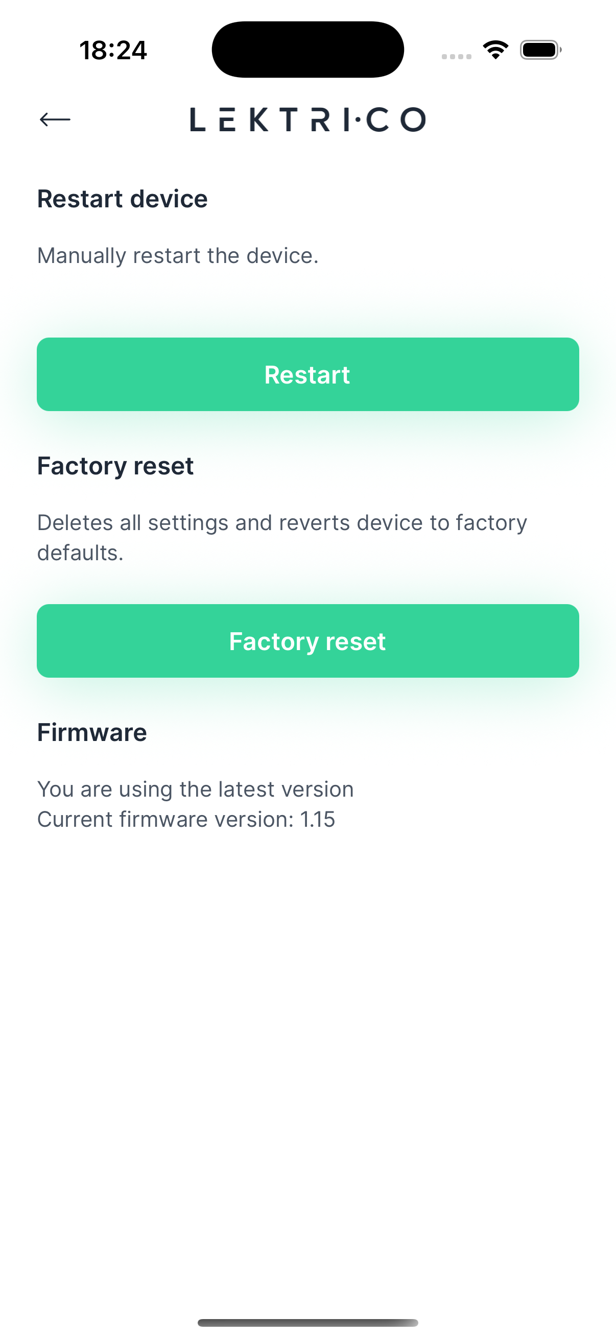 - Factory reset — Deletes all settings and reverts the charger to factory defaults.