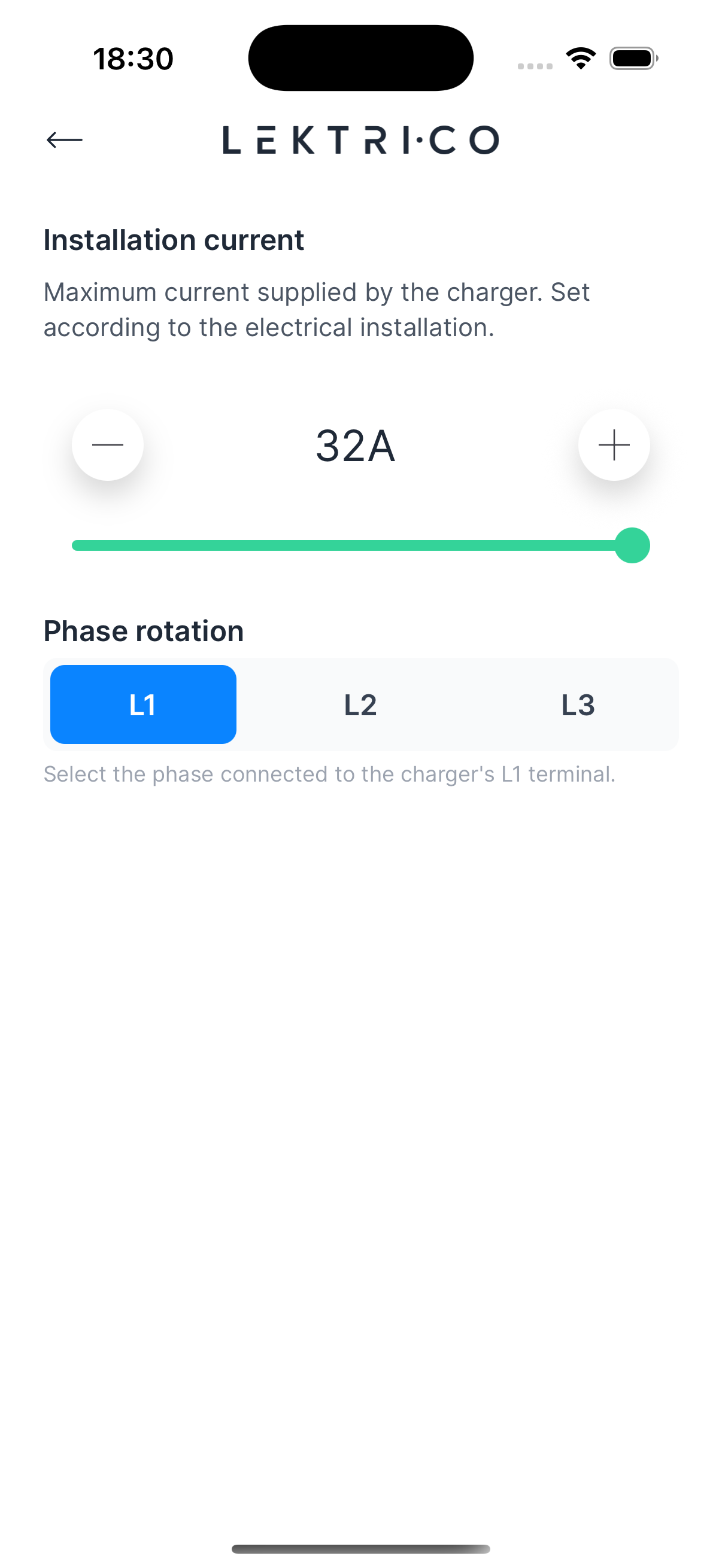 - Phase rotation — Select the phase connected to the charger's L1 terminal.