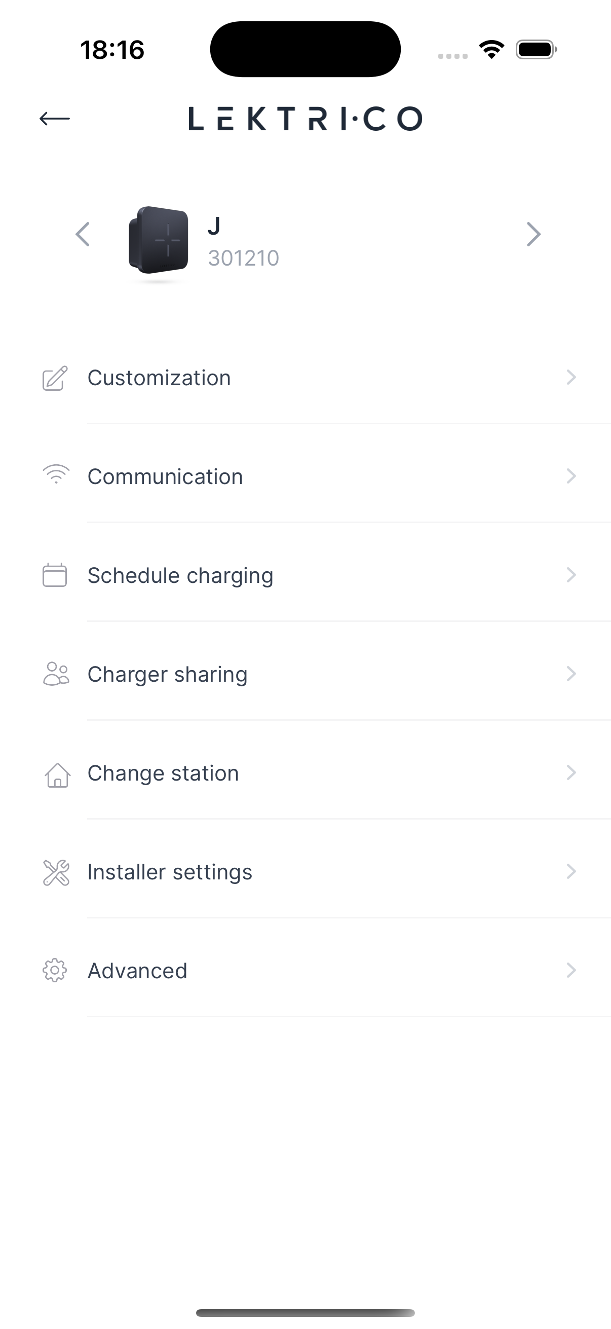 Available options: Schedule charging, Customization, Communication (RFID, WiFi, OCPP), Charger sharing, Change station, Installer settings, Advanced.
