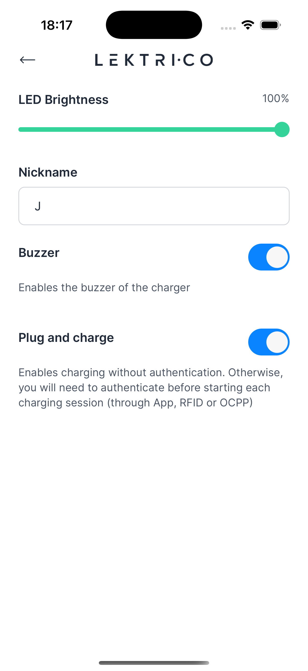 - Plug and charge — When enabled, charging starts automatically without authentication. When disabled, you must authenticate via the app, RFID, or OCPP before each session.